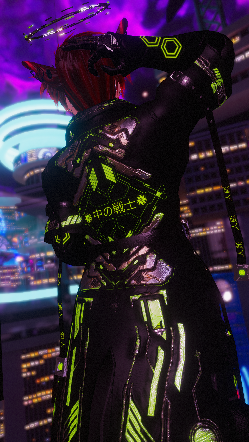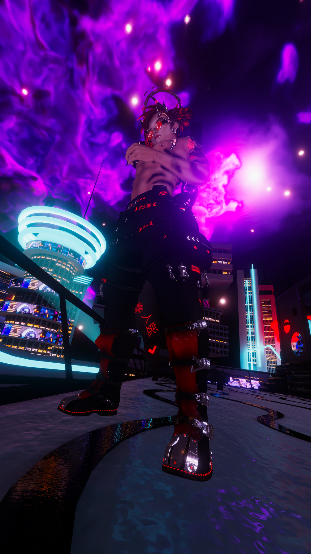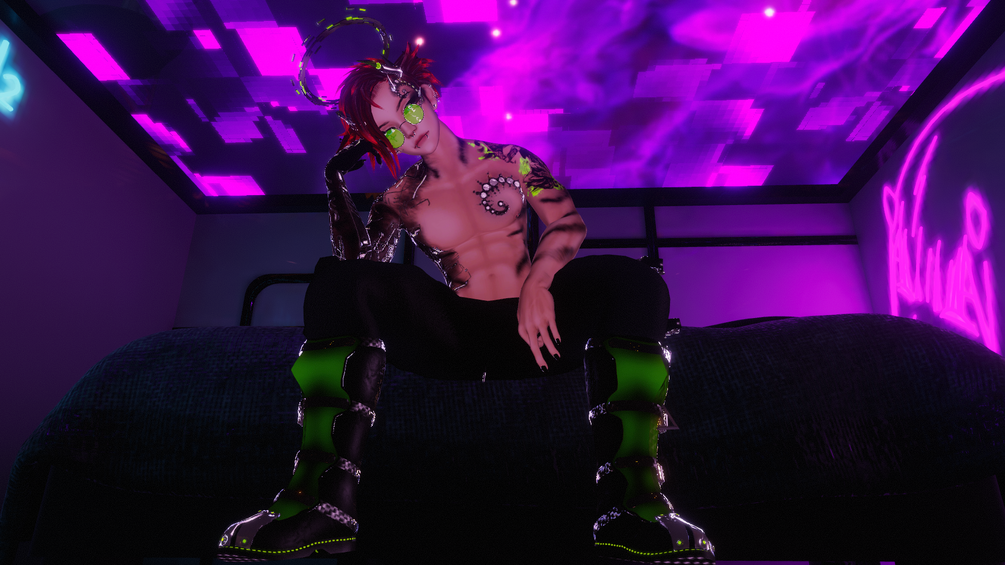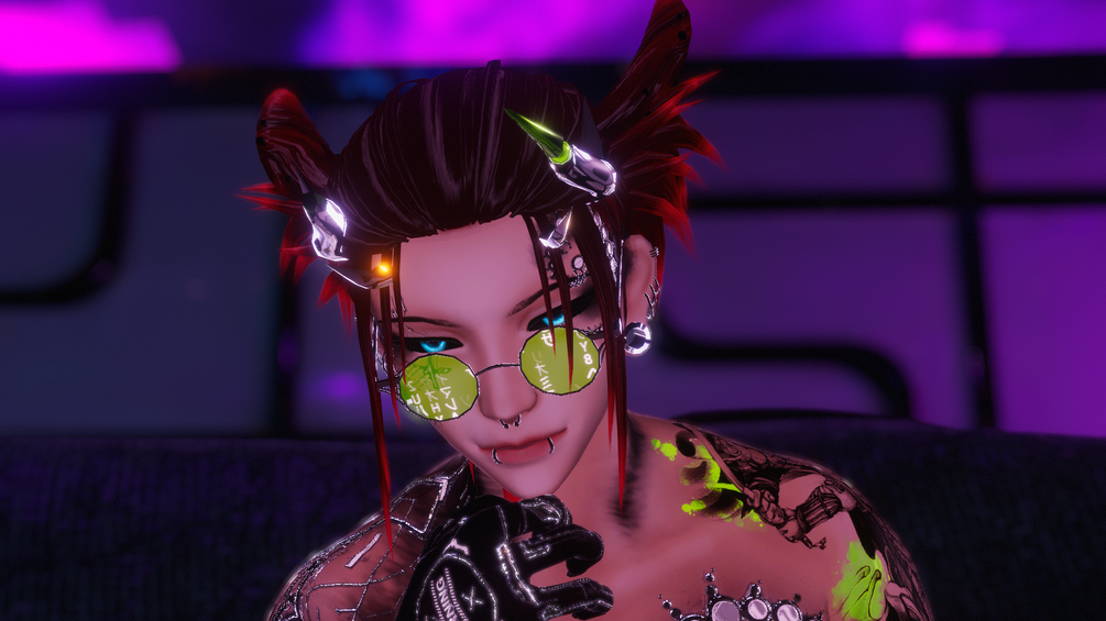 Coat, top, armwarmers, boots, glasses, ponytail, mohawk, fox ears, all jewelry, nipples, fingernails, karambit, split tongue (mapped to head texture) and all the textures to it are made from scratch by me in Blender and Substance Painter.