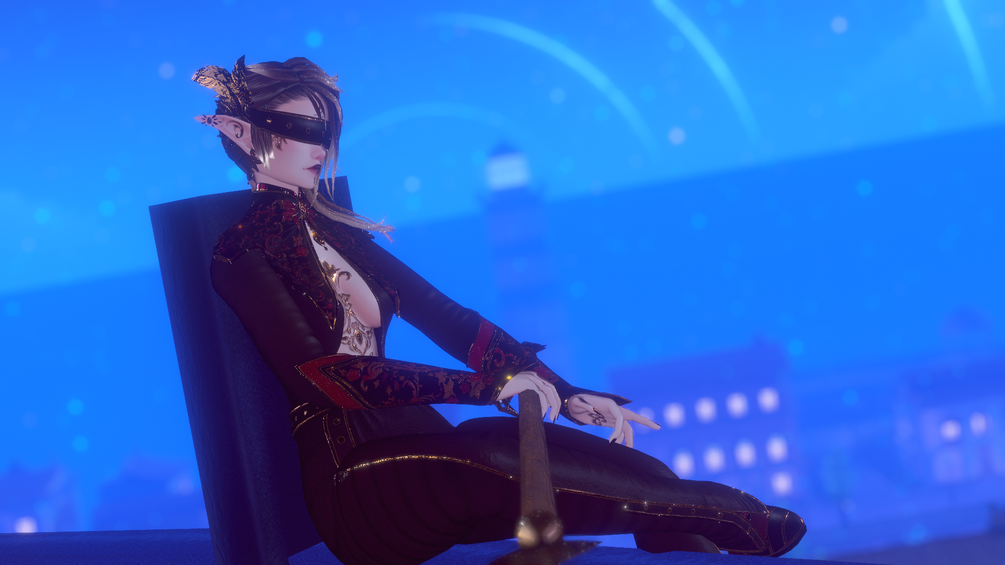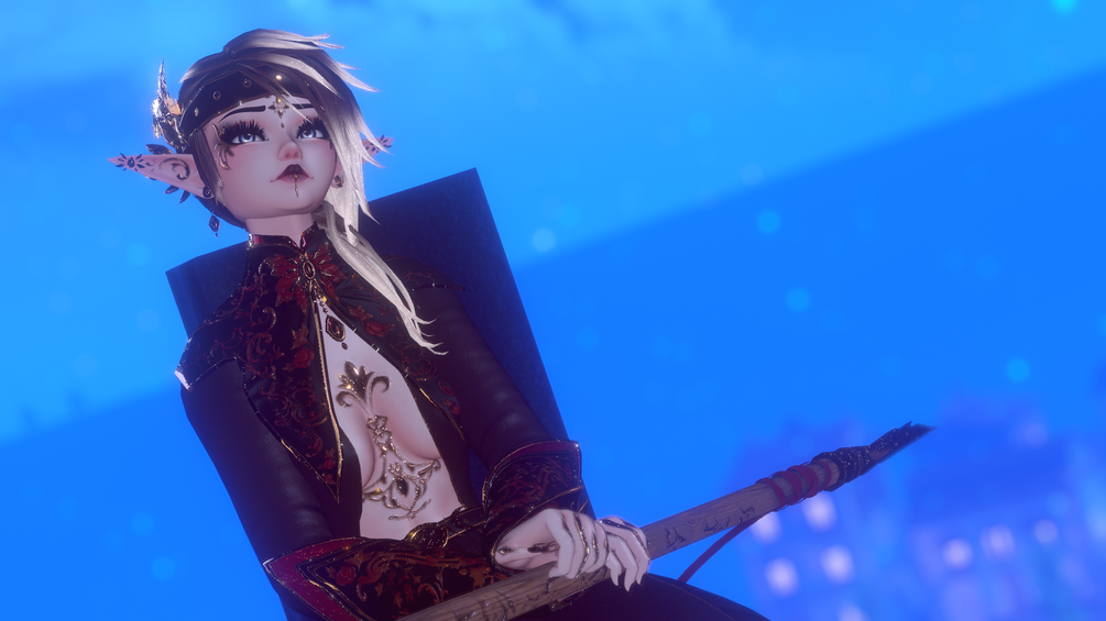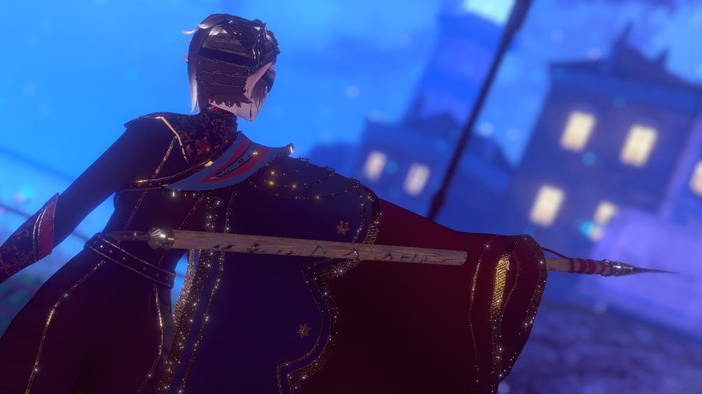 Whole outfit (cape, suit, boots, belt, bracers), spear, jewelry, blindfold headpiece, hair (LINK) and all the textures to it are made from scratch by me in Blender and Substance Painter.