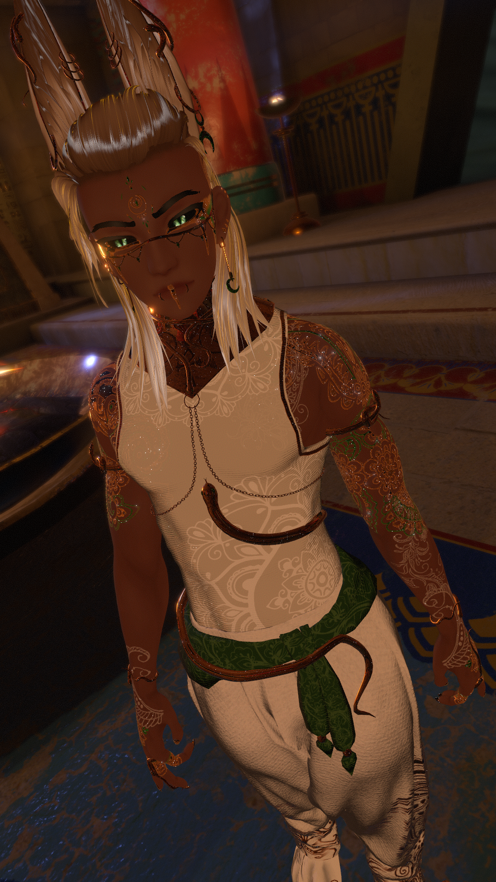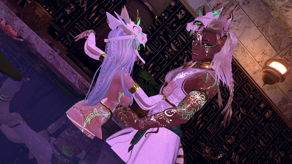 Top (remesh of base), ears, tail, face veil, belt cloth, collar, braids, finger- and toenails, nipples, other jewelry and all the textures to it are made from scratch by me in Blender and Substance Painter.